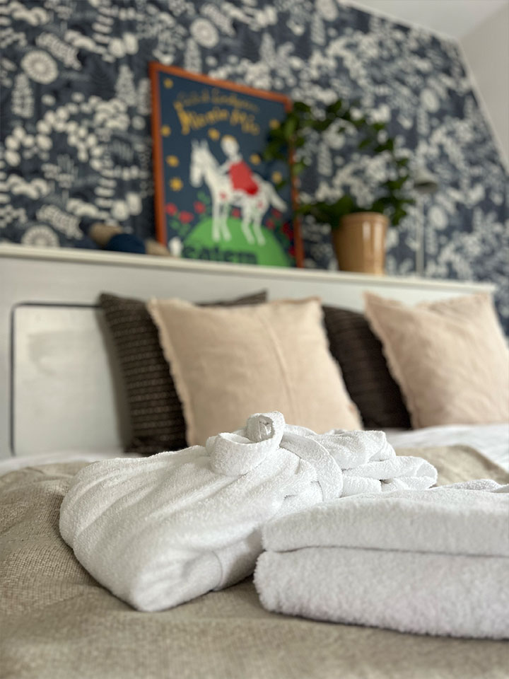 Rummet Astrid Lindgren är rymligt och inbjudande med fönster mot vår lummiga trädgård, perfekt både för avkoppling och kvalitetstid med familjen eller kompisgänget. Den sköna dubbelsängen är generöst bäddad för bästa möjliga komfort och en god natts sömn. Dessutom finns en bekväm bäddsoffa som enkelt kan göras om till två extra sängplatser, vilket gör rummet perfekt för familjer eller sällskap som vill bo tillsammans. Här råder devisen från Astrid Lindgren – ”Det är så roligt att leva tycker jag, när man har tid att stanna upp och se på världen”