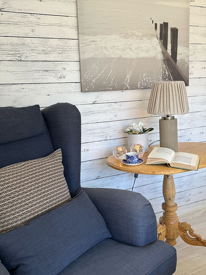 Vår svit Havsateljen är en romantisk oas inredd med en mjuk färgskala som skapar en fridfull och avkopplande atmosfär den sköna dubbelsängen ger en härlig komfort och är perfekt för en god natts sömn, medan den vackra utsikten mot havet fyller det vackra rummet med ljus och en känsla av stillhet. Sviten har en egen entré och en möblerad veranda som vetter mot havet, vilket gör det till en idealisk plats för att njuta av sommarkvällar. Här kan du koppla av med en kopp kaffe eller ett glas vin medan solen gå ner över havet.