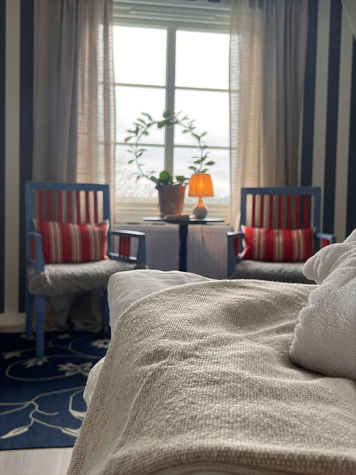 Rummet Sally Bauer är en ombonad och trivsam oas på 22kvm. De bekväma sängarna är inbjudande och bäddade med mjuka textilier för en god natts sömn. I rummet finns en liten sitthörna med utsikt över havet. Här kan du koppla av och njuta av lugnet, samtidigt som du har havet som en ständig närvarande bakgrund.